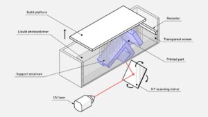 در مدل پرینترهای SLA، از رزین مایع استفاده میشود و رزین بصورت لایه لایه پرینت گرفته میشود و به کمک اشعه فرابنفش جهت پخت یا به اصطلاح خشک شدن لایه ها منجر به ساخت نمونه می شود.